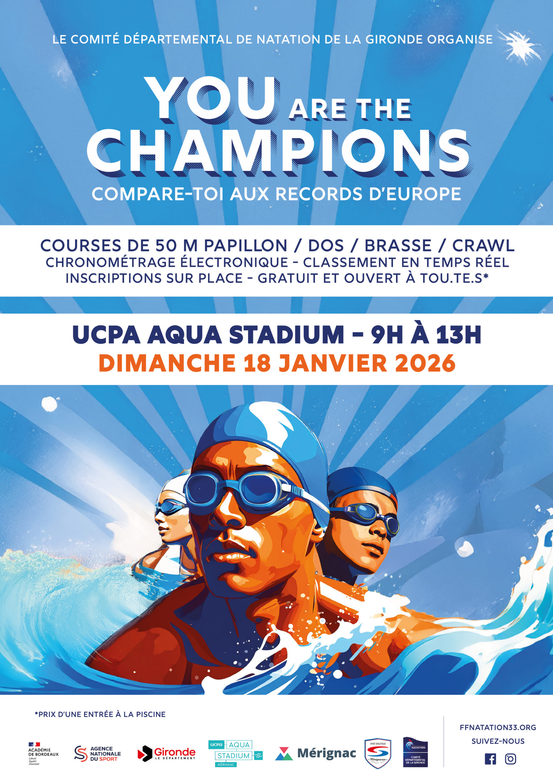 Le Comité Départemental de Natation de la Gironde a organisé, le dimanche 18 janvier à l’UCPA Aqua Stadium, de 9h à 13h, un événement permettant aux nageuses et nageurs de tous les jours de se comparer aux championnes et champions en se chronométrant sur l’épreuve de leur choix.